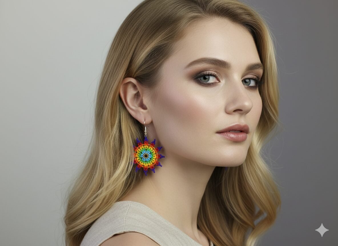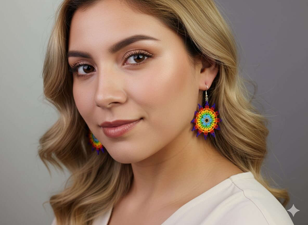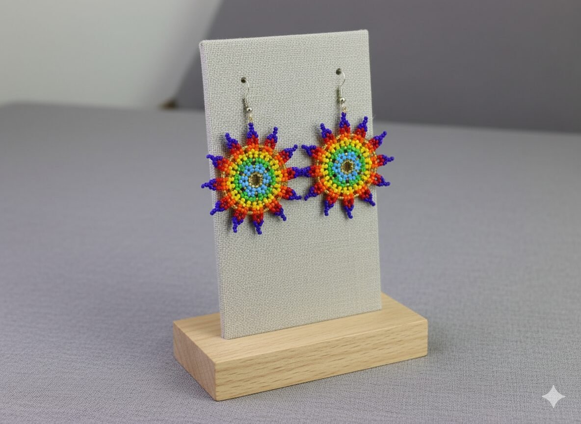 Fabricados con mostacillas, estos aretes presentan un acabado vibrante y colorido que captura la esencia del arte huichol. Su diseño de flor estrella no solo es atractivo, sino que también refleja la rica herencia cultural de México, convirtiéndolos en una opción ideal para quienes valoran la artesanía y la originalidad en sus accesorios.