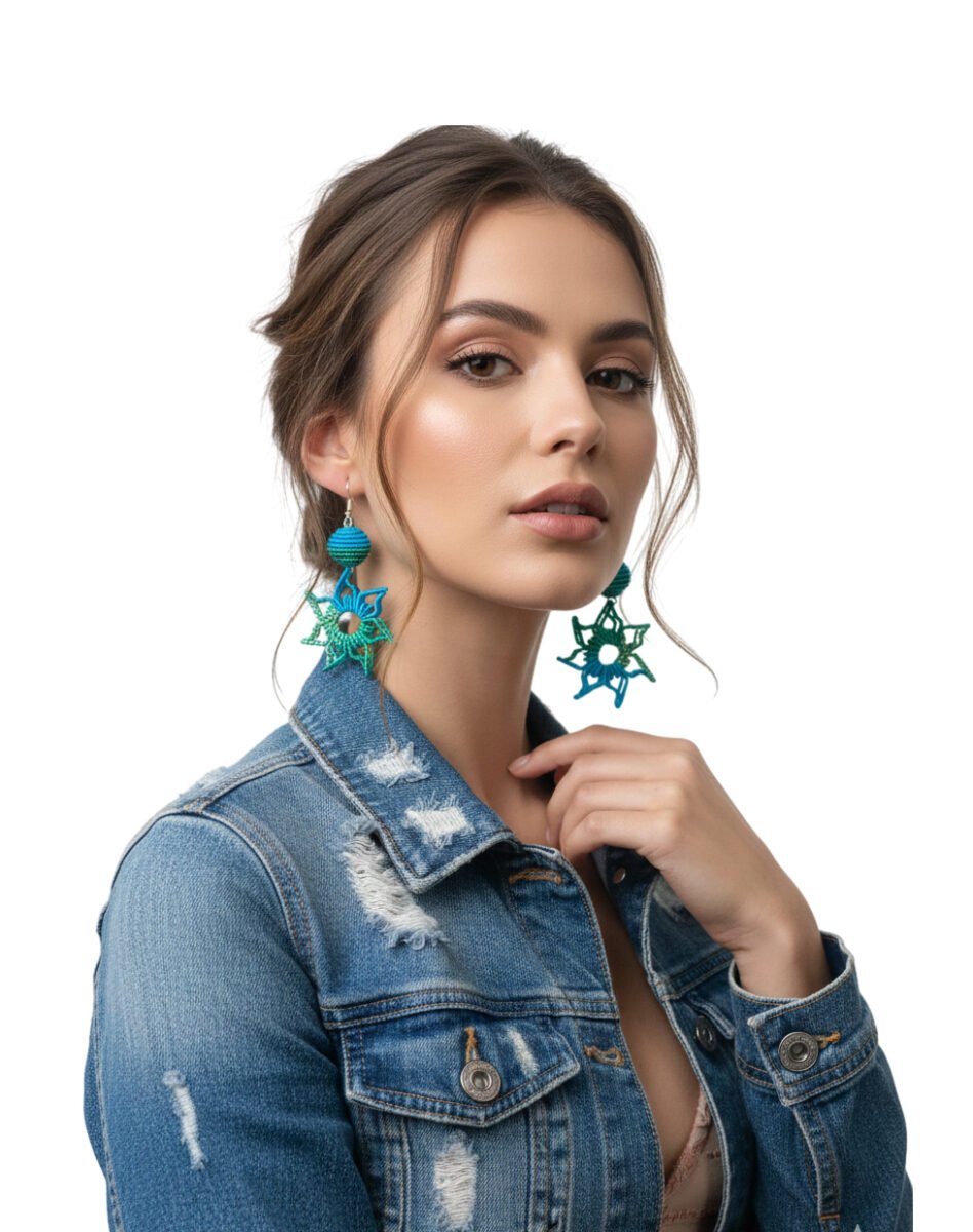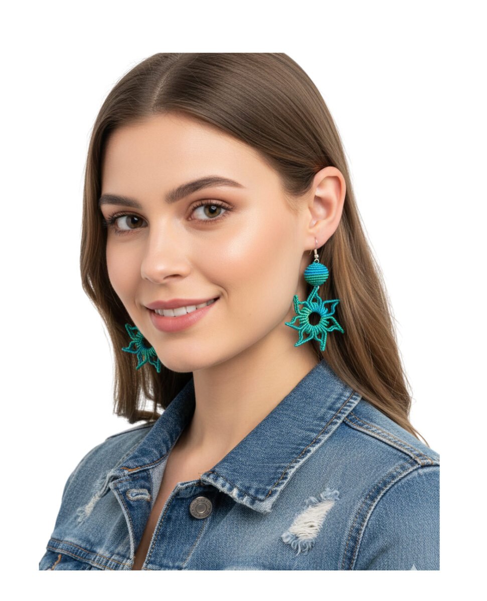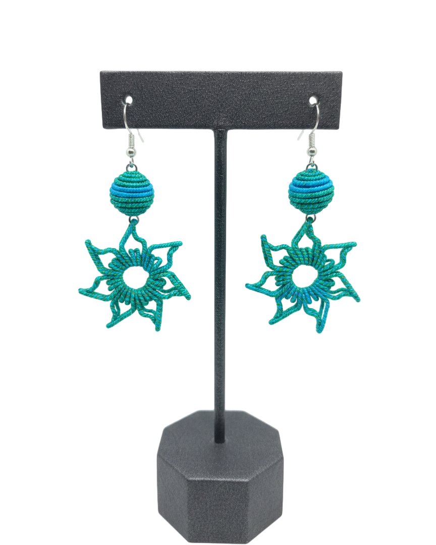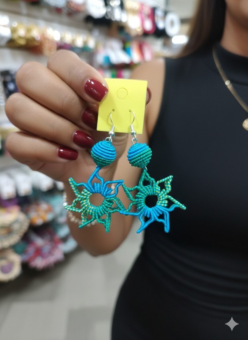 Aretes Tejidos A Mano Artesanales en forma de sol. Cada par es una obra maestra, elaborada con hilo tejido a mano, que refleja la dedicación y el talento de artesanos comprometidos con la calidad y el diseño único.
