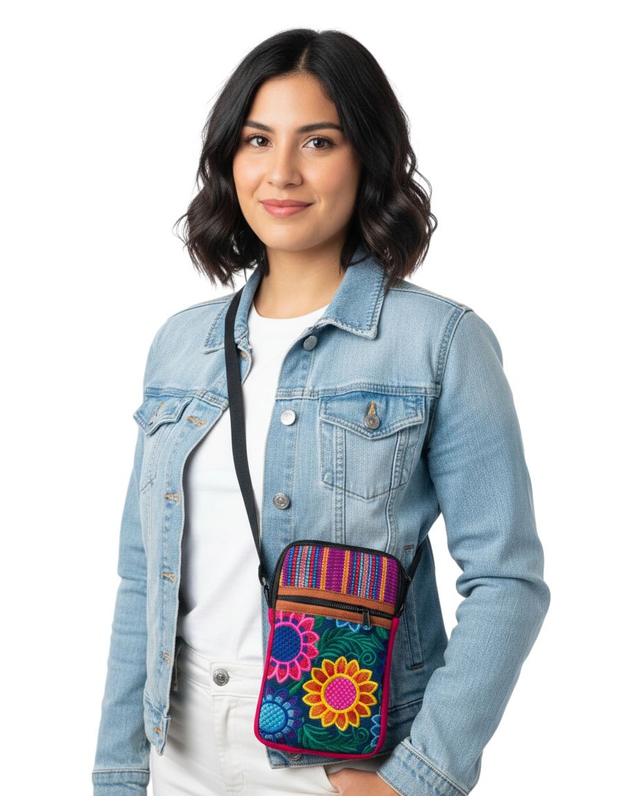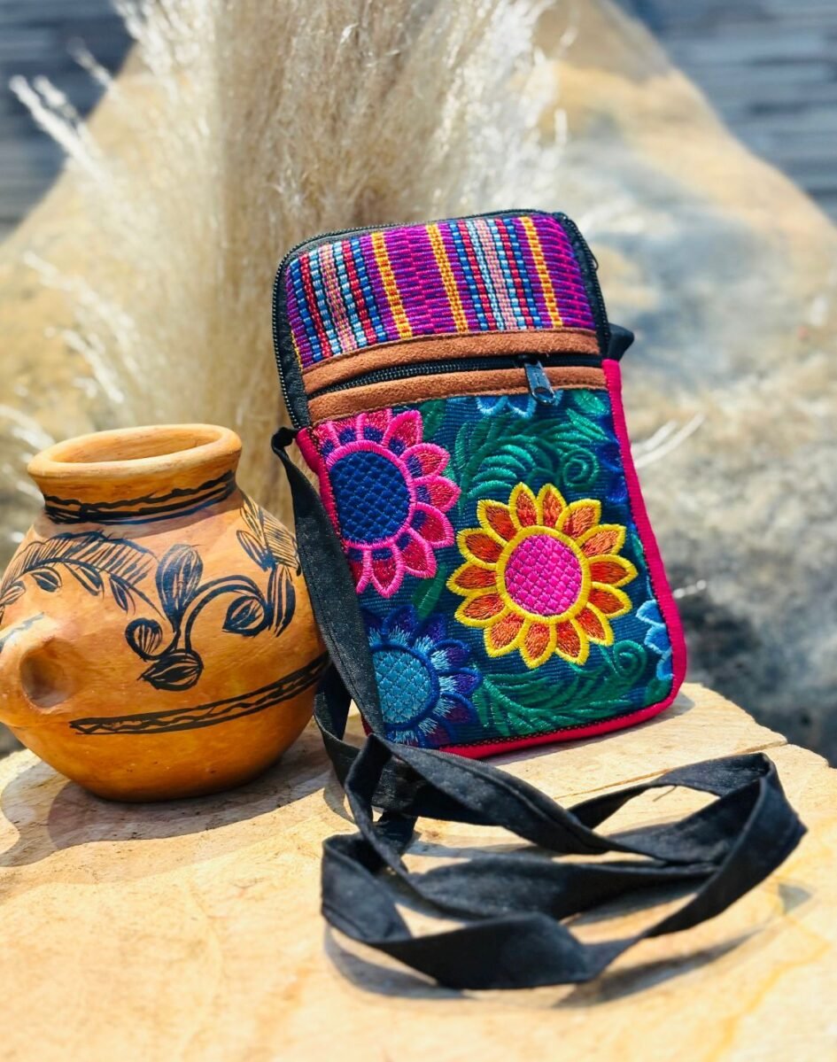 El encantador bordado floral añade un toque de elegancia y frescura, convirtiendo esta bolsa en un complemento versátil que se adapta a diferentes estilos. Con un forro interior que protege tus objetos, esta bolsa es ideal para llevar tu celular y otros esenciales de manera organizada.