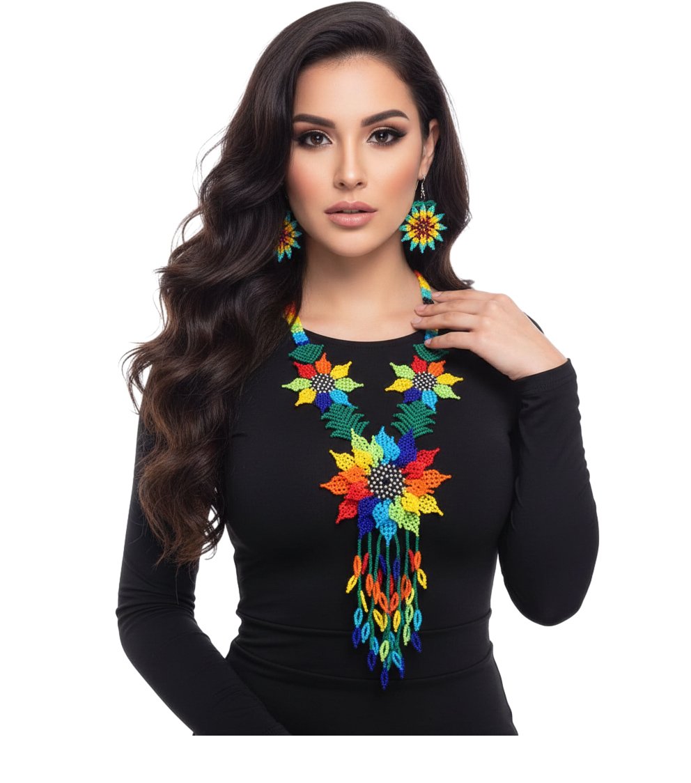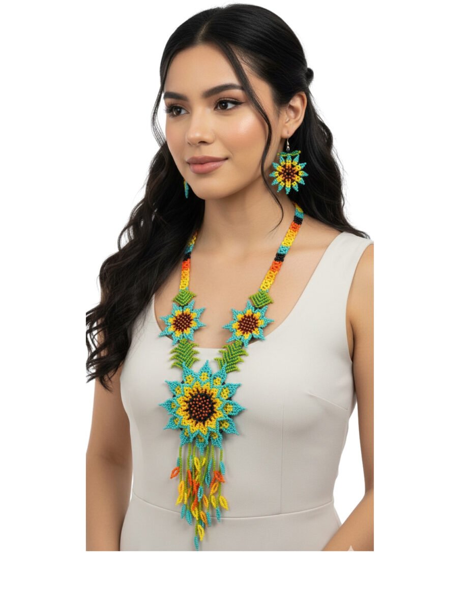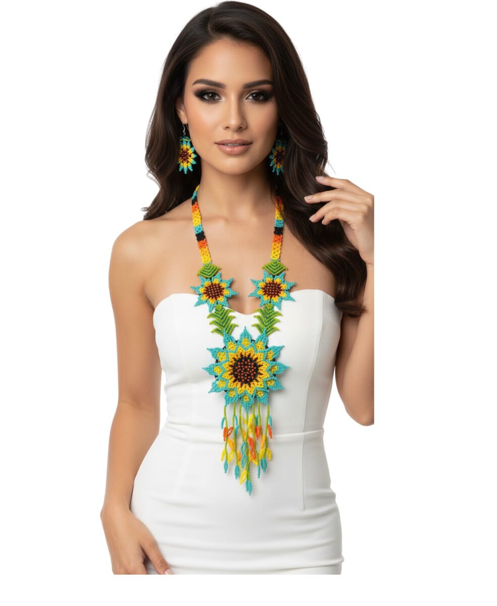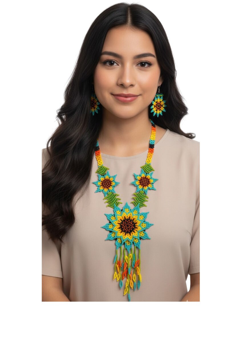 Luce este collar largo de girasol y destaca tu personalidad con un estilo que refleja tu esencia. Cada pieza es un testimonio de la dedicación y el arte que se ha puesto en su creación, haciendo de este set una elección ideal para quienes aprecian la moda con significado.